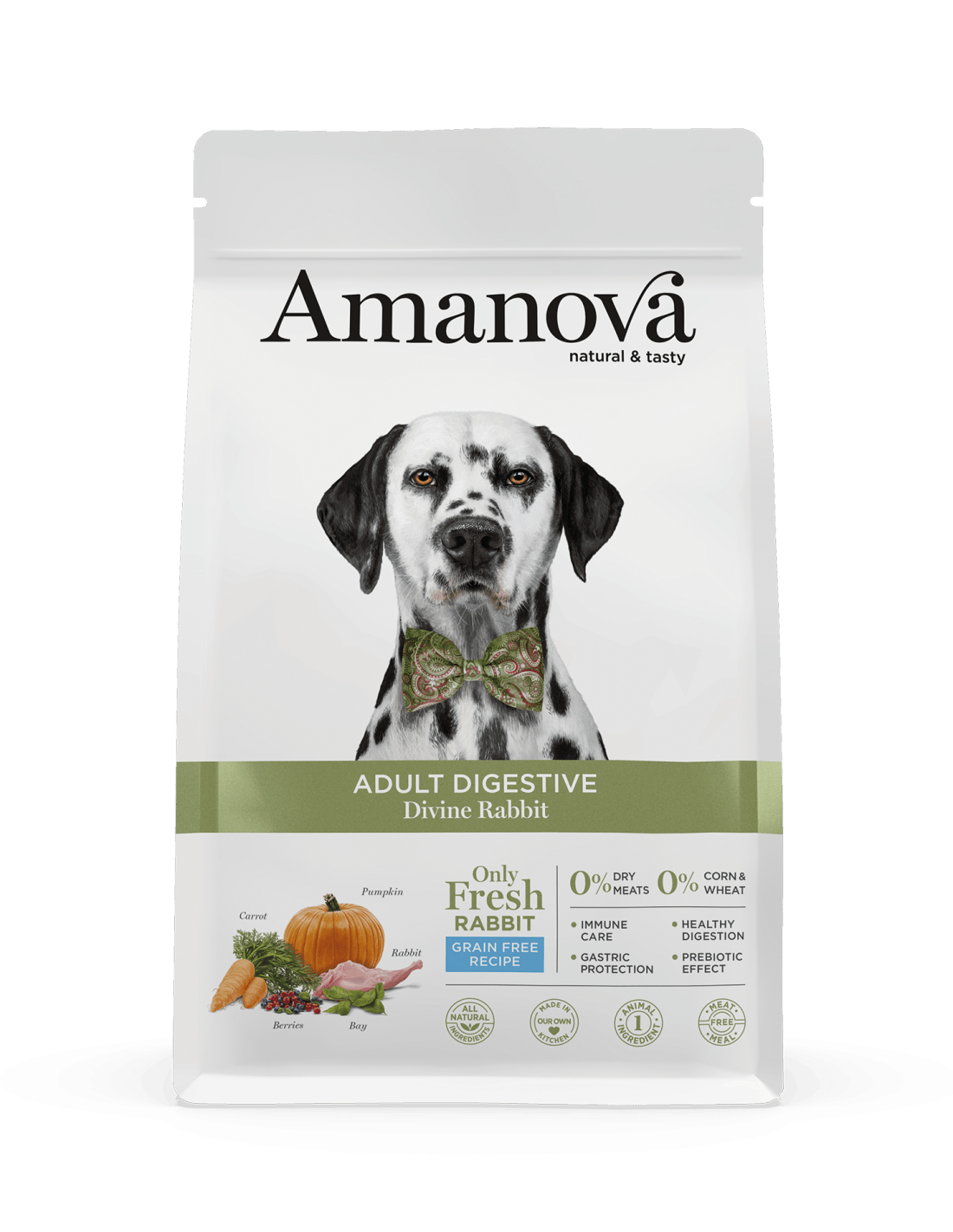 Amanova Adult Digestive, es un pienso digestivo preparado únicamente con carne fresca de conejo como única fuente animal, baja en calorías, colesterol y grasas, está repleta de proteínas y minerales esenciales para la salud de tu perro.