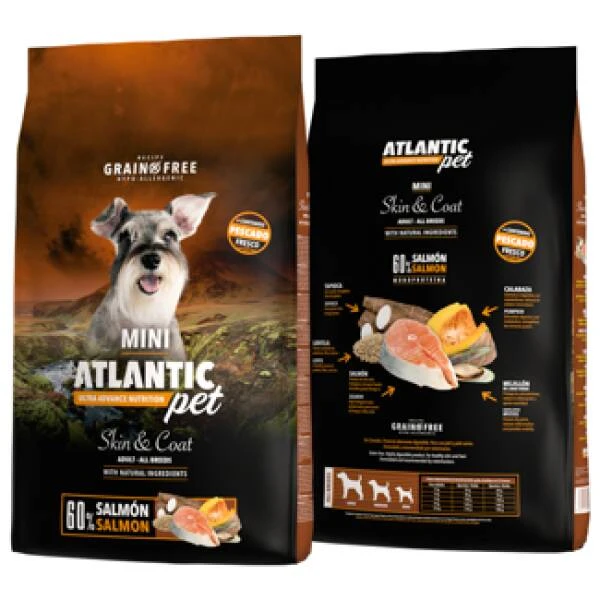 ATLANTICPET ULTRA PREMIUM MINI SKIN&COAT, es un alimento destinado para razas pequeñas con alergias o problemas de piel preparado únicamente con salmón, como única fuente animal, alto en omega 3, disminuyendo el riesgo de padecer enfermedades cardiovasculares, como infarto, arritmias e insuficiencia cardíaca.