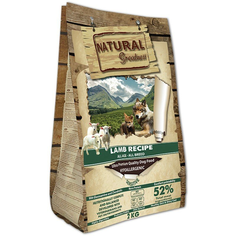 Natural Greatness Receta Cordero es un pienso natural hipoalergénico para perros de razas medianas y grandes, tanto cachorros como adultos y senior. Contiene una única proteína cárnica, la del cordero de grado humano. Este contenido exclusivo de una única proteína hace que Natural Greatness Lamb Recipe pueda darse a perros alérgicos o intolerantes a otras carnes. Además al no contener cereales, conservantes ni colorantes artificiales, se trata de un alimento altamente digestible y tolerado incluso por los perros con estómagos sensibles
