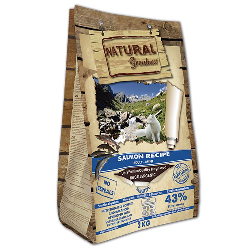 Natural Greatness Receta Salmón Mini es un pienso hipoalergénico formulado especialmente para perros adultos de razas pequeñas. Esta receta no contiene cereales y se elabora utilizando salmón de grado humano y patata, ingredientes de calidad superior.