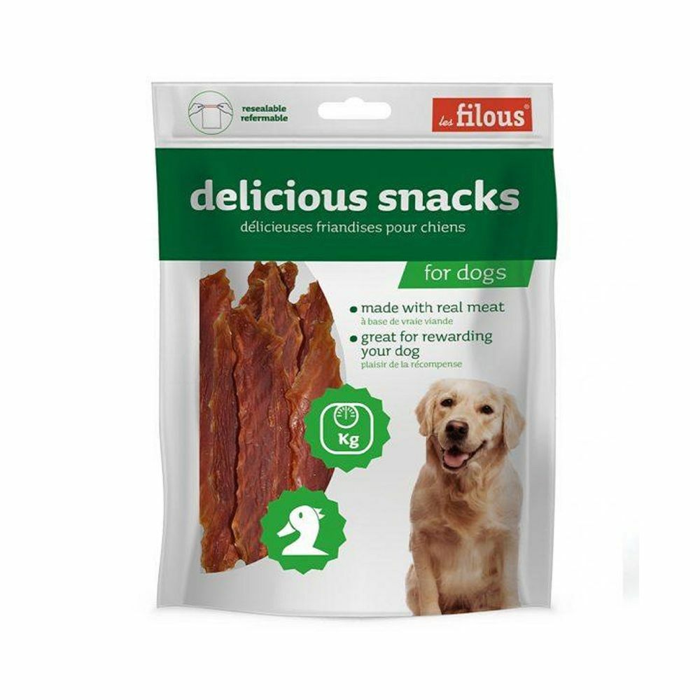 Deliciosas recompensas para perros: palitos de piel de res recubiertos de carne de pato.