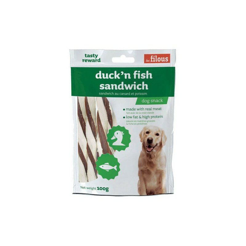 - Golosinas para perros con sándwich de pato y pescado